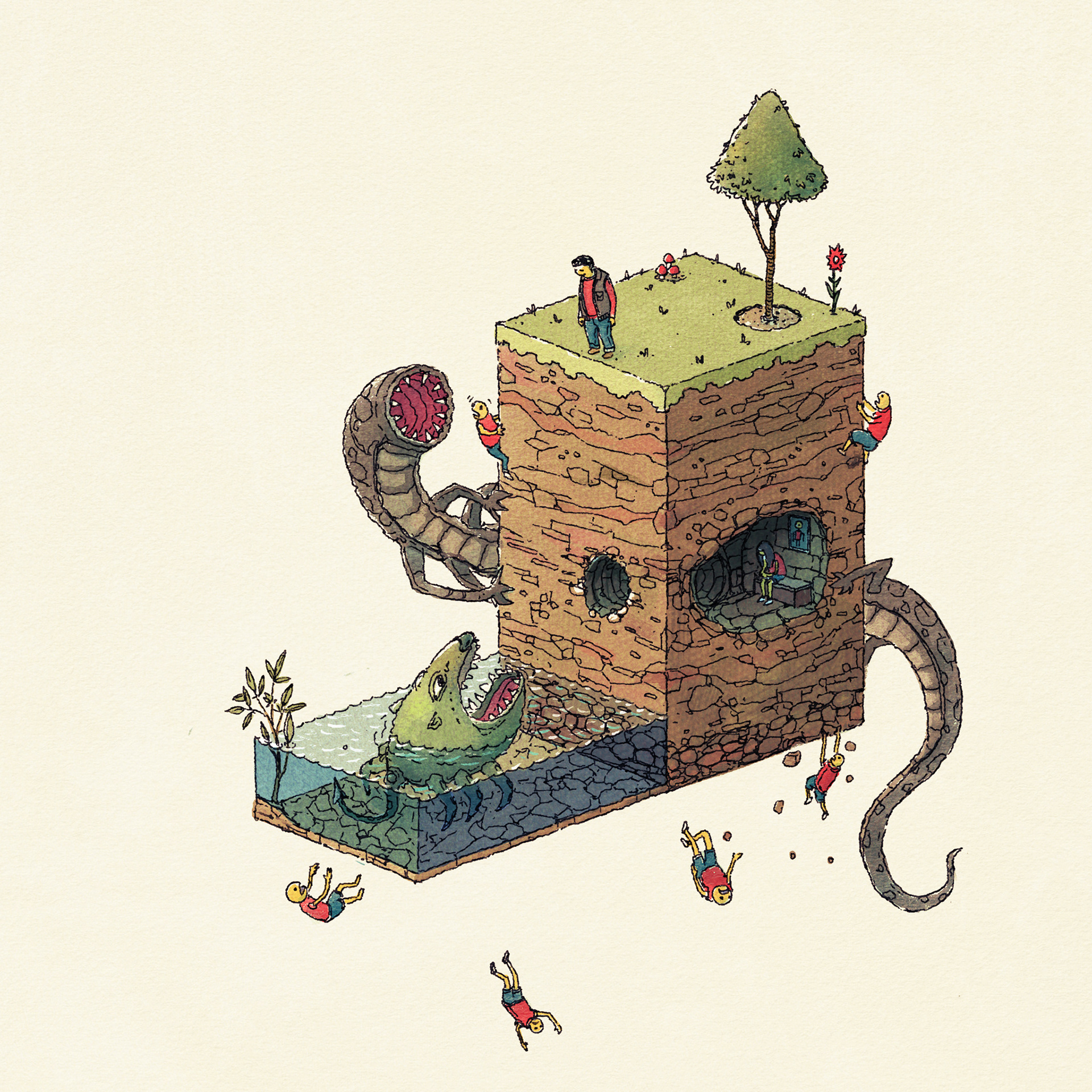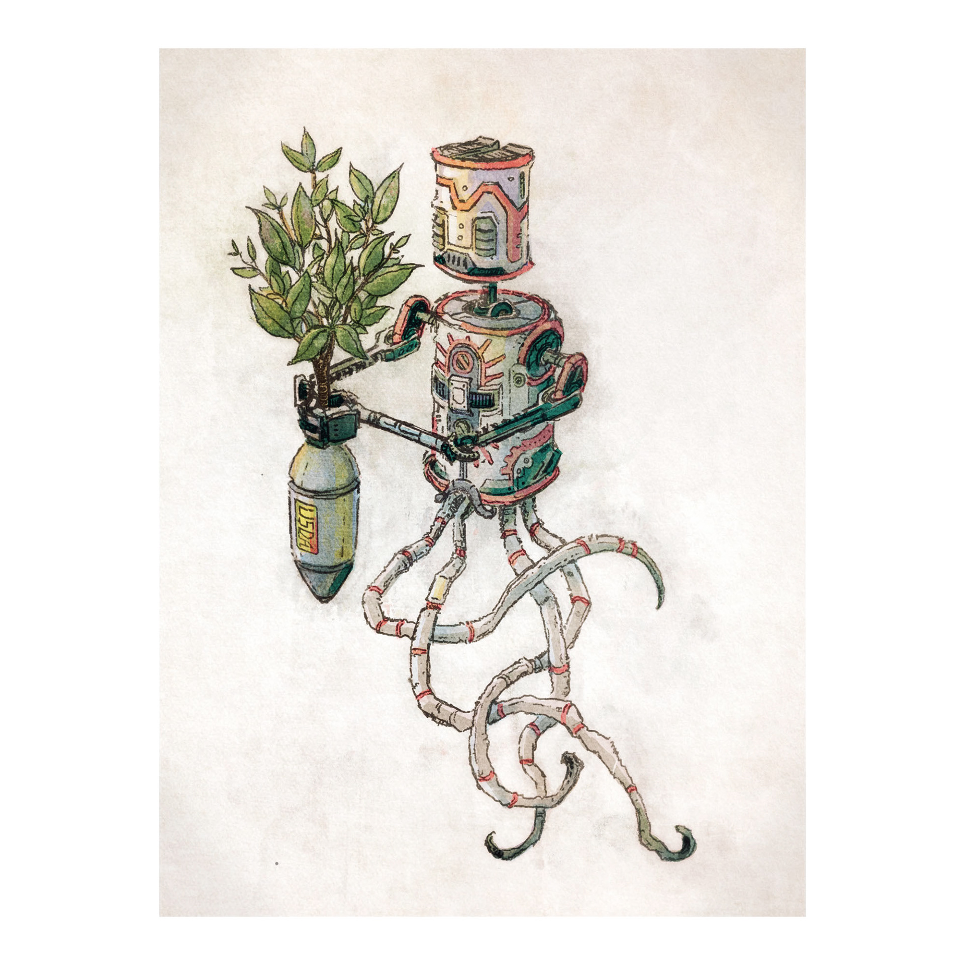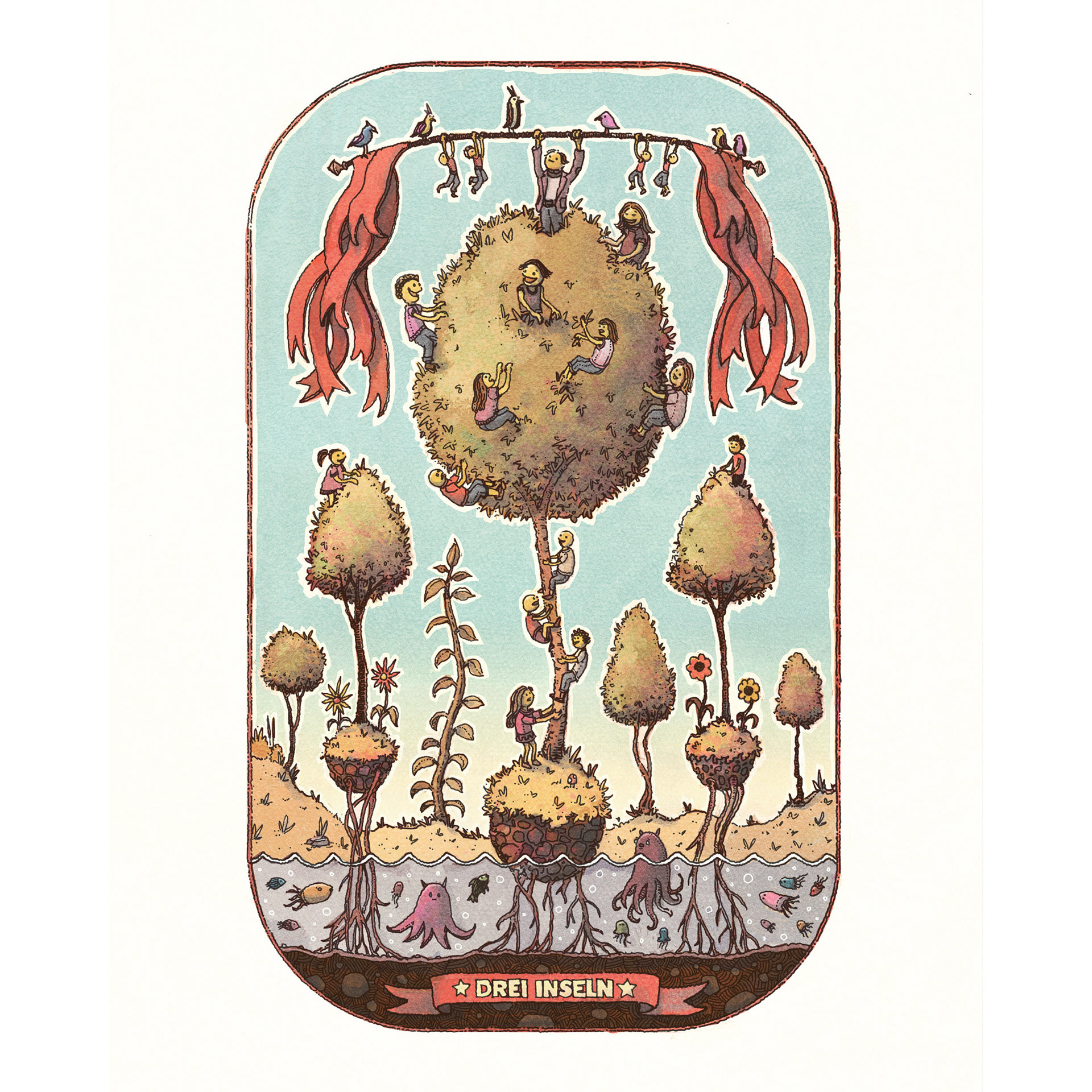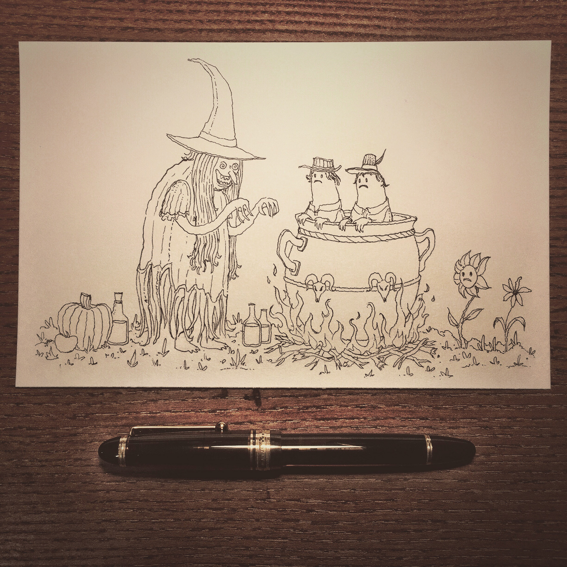 A collection of illustrations with pen & ink drawings digitally colored in Photoshop, Procreate, and Rebelle 3.