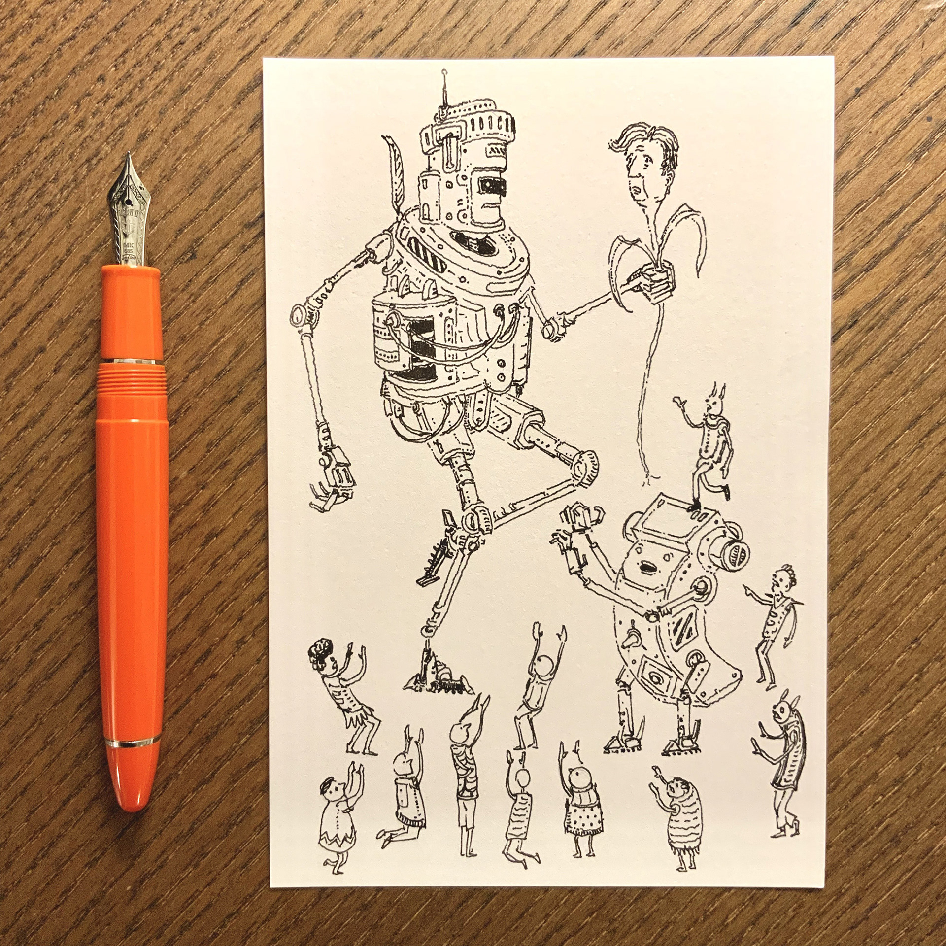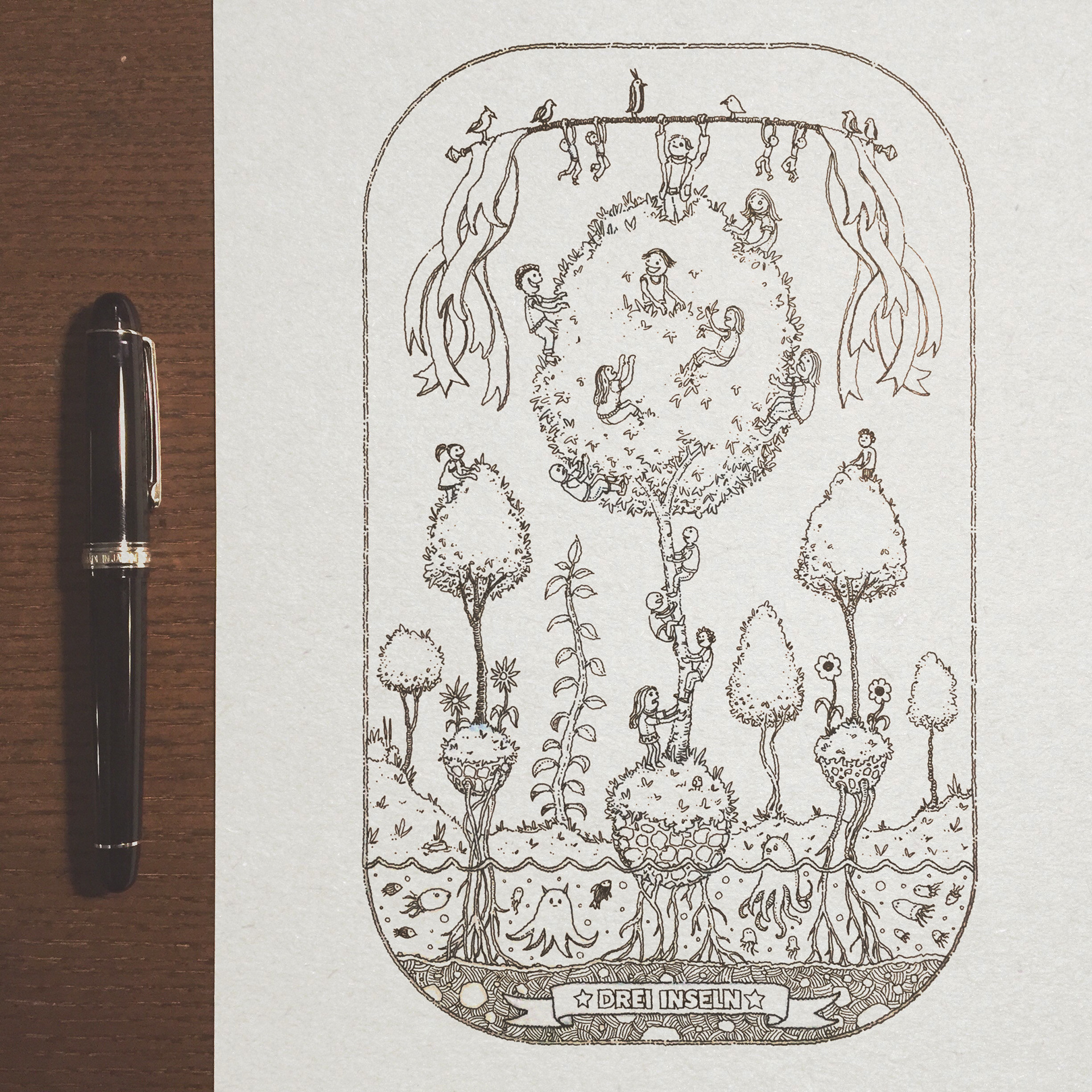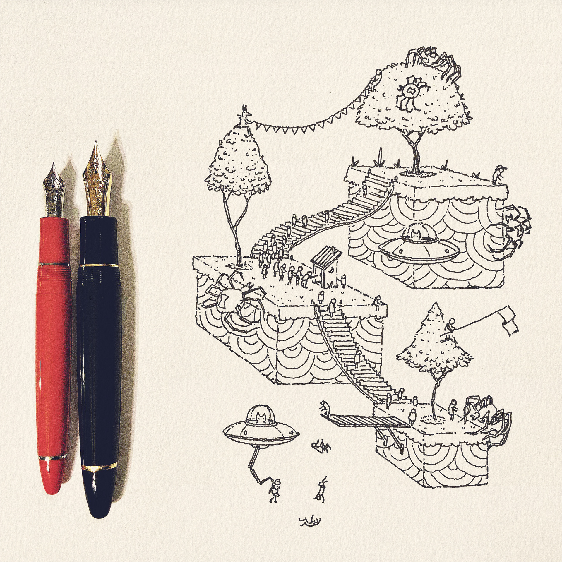 A collection of illustrations with pen & ink drawings digitally colored in Photoshop, Procreate, and Rebelle 3.